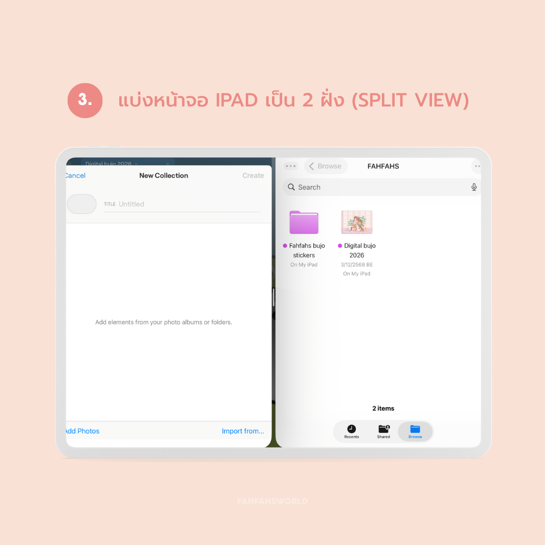 เลื่อนไปทางขวาสุดของแถบ Elements แล้วแตะเครื่องหมาย “+” (เพิ่มชุดใหม่) หน้าต่างเพิ่ม Elements จะเด้งขึ้นมา - แบ่งหน้าจอ iPad เป็น 2 ฝั่ง (Split View)