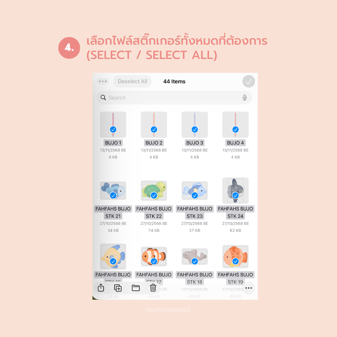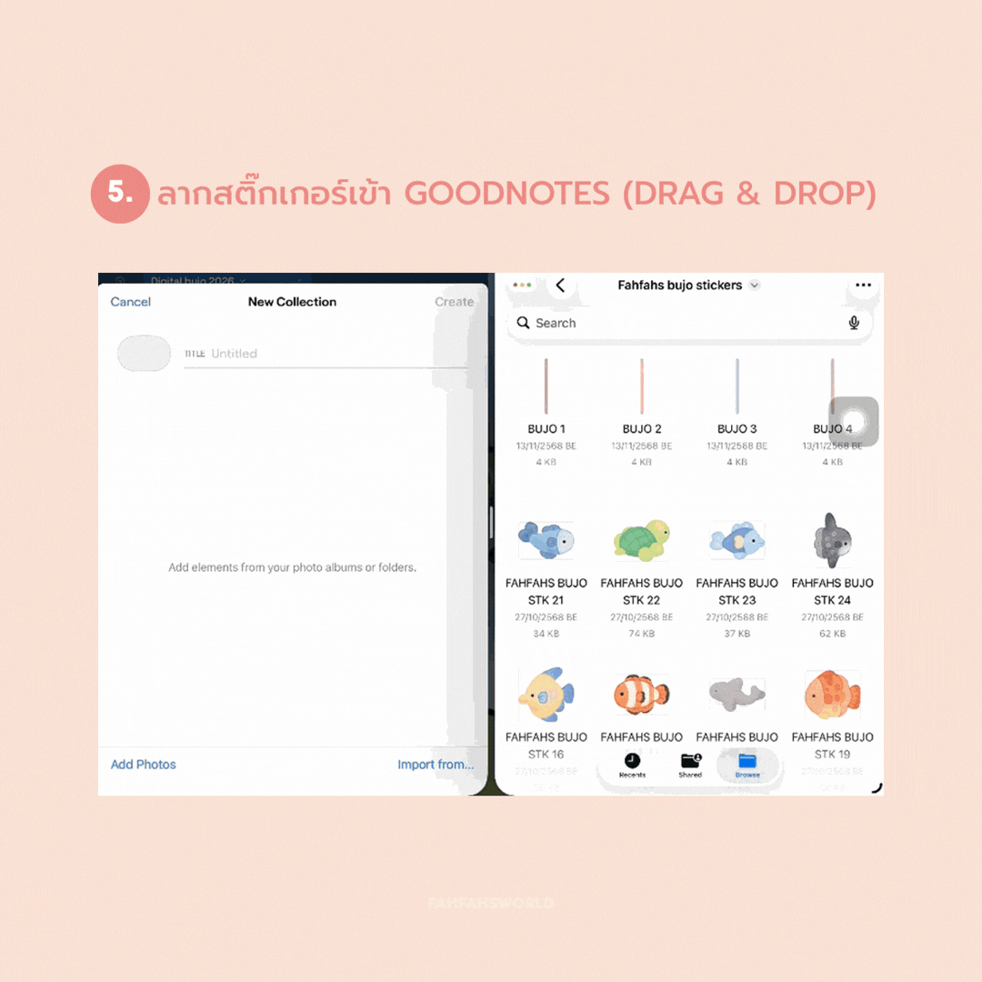 ใช้ฟังก์ชัน Split View (แบ่งหน้าจอ) เปิดแอป GoodNotes อยู่ฝั่งหนึ่ง และแอป Files (ไฟล์ของเรา) อยู่อีกฝั่ง เพื่อให้ลากสติ๊กเกอร์เข้ามาได้สะดวก - เลือกไฟล์สติ๊กเกอร์ทั้งหมดที่ต้องการ (Select / Select All)