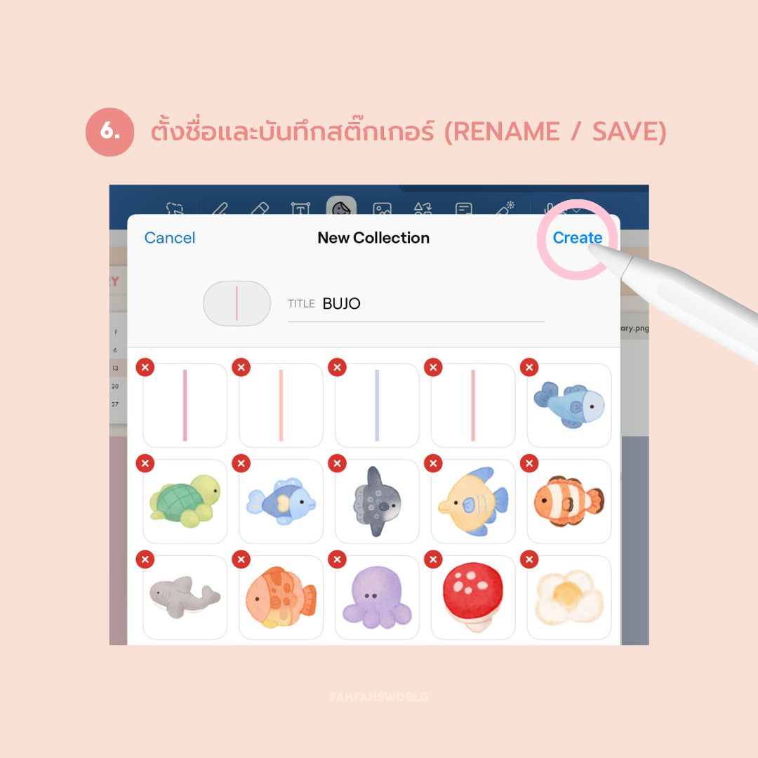 เมื่อสติ๊กเกอร์ทั้งหมดถูกเพิ่มเข้ามาแล้ว ให้แตะตั้งชื่อชุด Elements ตามที่ต้องการ จากนั้นกด Save (บันทึก) - พร้อมใช้งานใน GoodNotes แล้ว (Use in Elements)